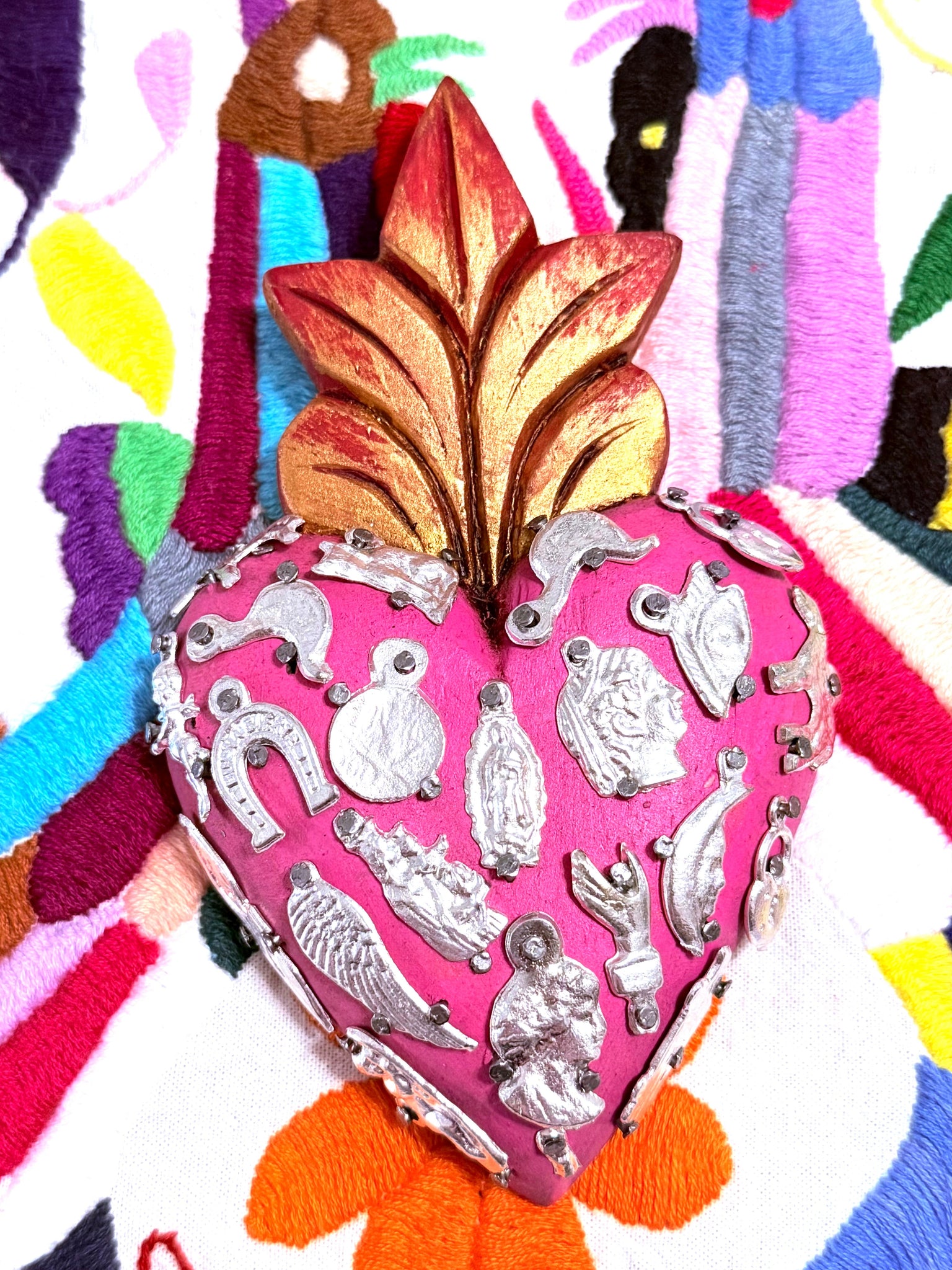 Mexican sacred hearts painted in rich colors and adorned with small metal "milagros" that represent blessings
